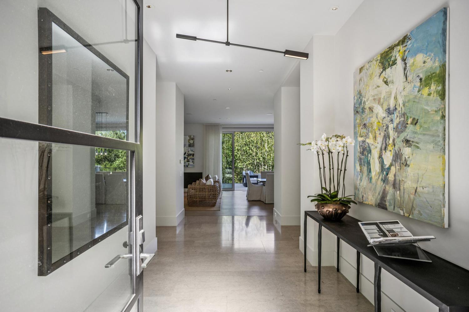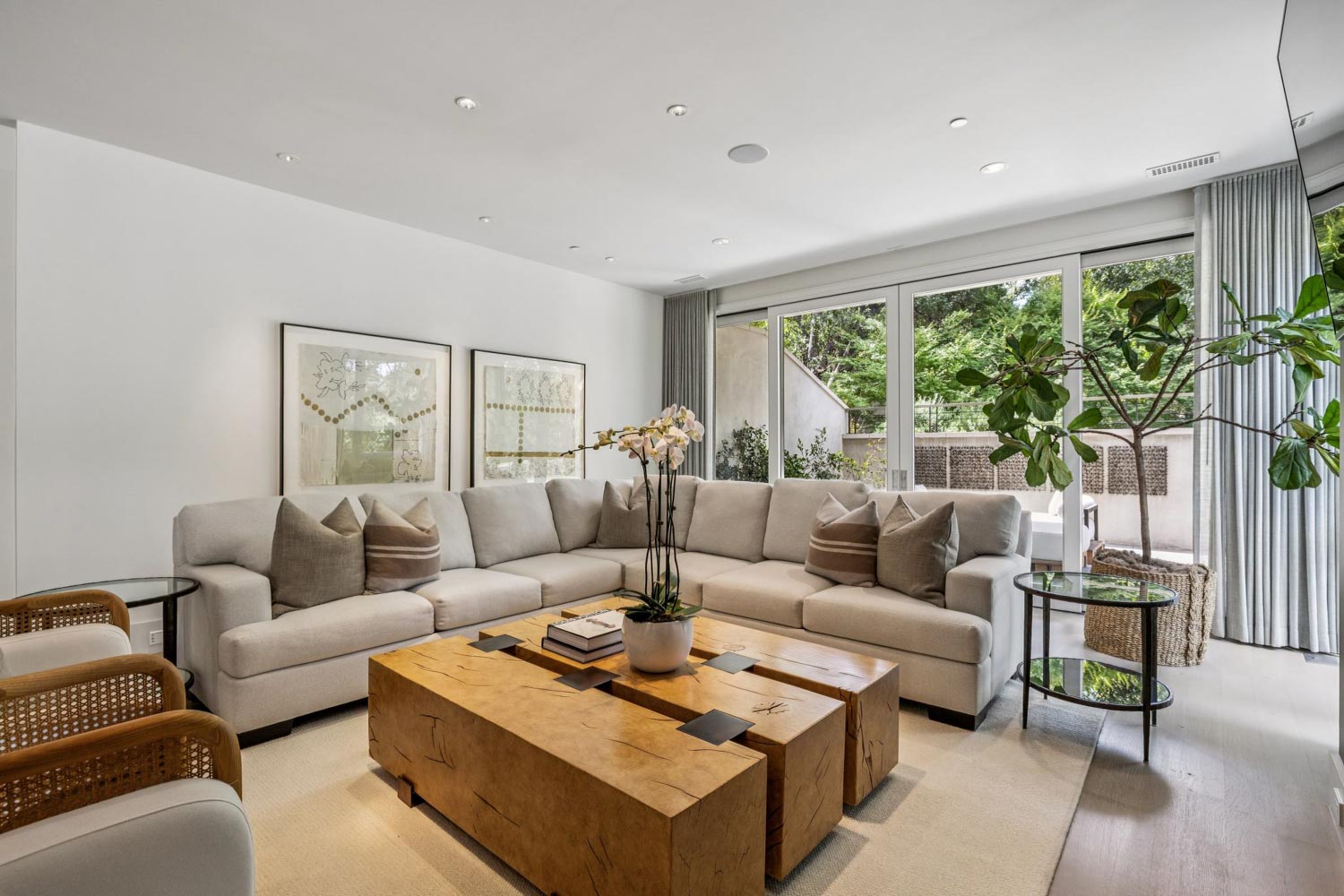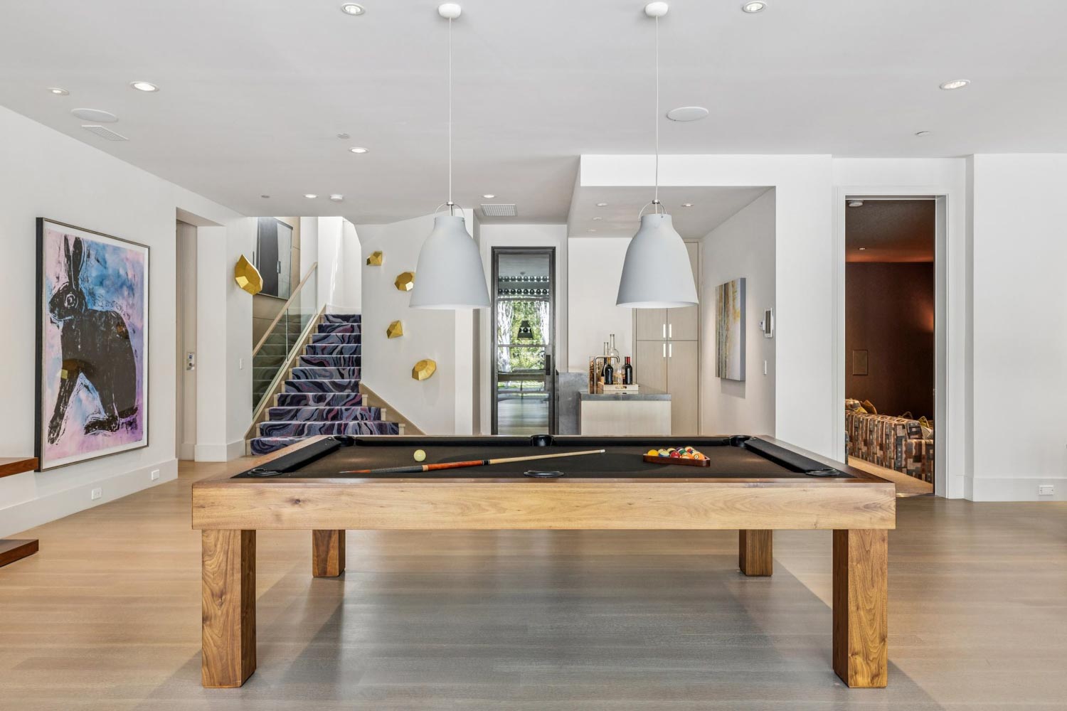 Acclaimed landscape architect Pamela Burton designed the incredible grounds to create privacy and offer different options for relaxing, playing, and entertaining. The ‘upper patios’ off the home serve as gathering places to relax and dine off all the major public rooms. A dining area with an adjacent built-in barbecue is located off the family room and kitchen area. A large staircase leads to the lower level of the yard, which includes a field for playing, a pool and spa with fountain, different lounging areas, a loggia, and an exercise porch. A guest house/cabana adds another amenity to the exterior, featuring a bar area with a sink and refrigerator and freezer drawers.