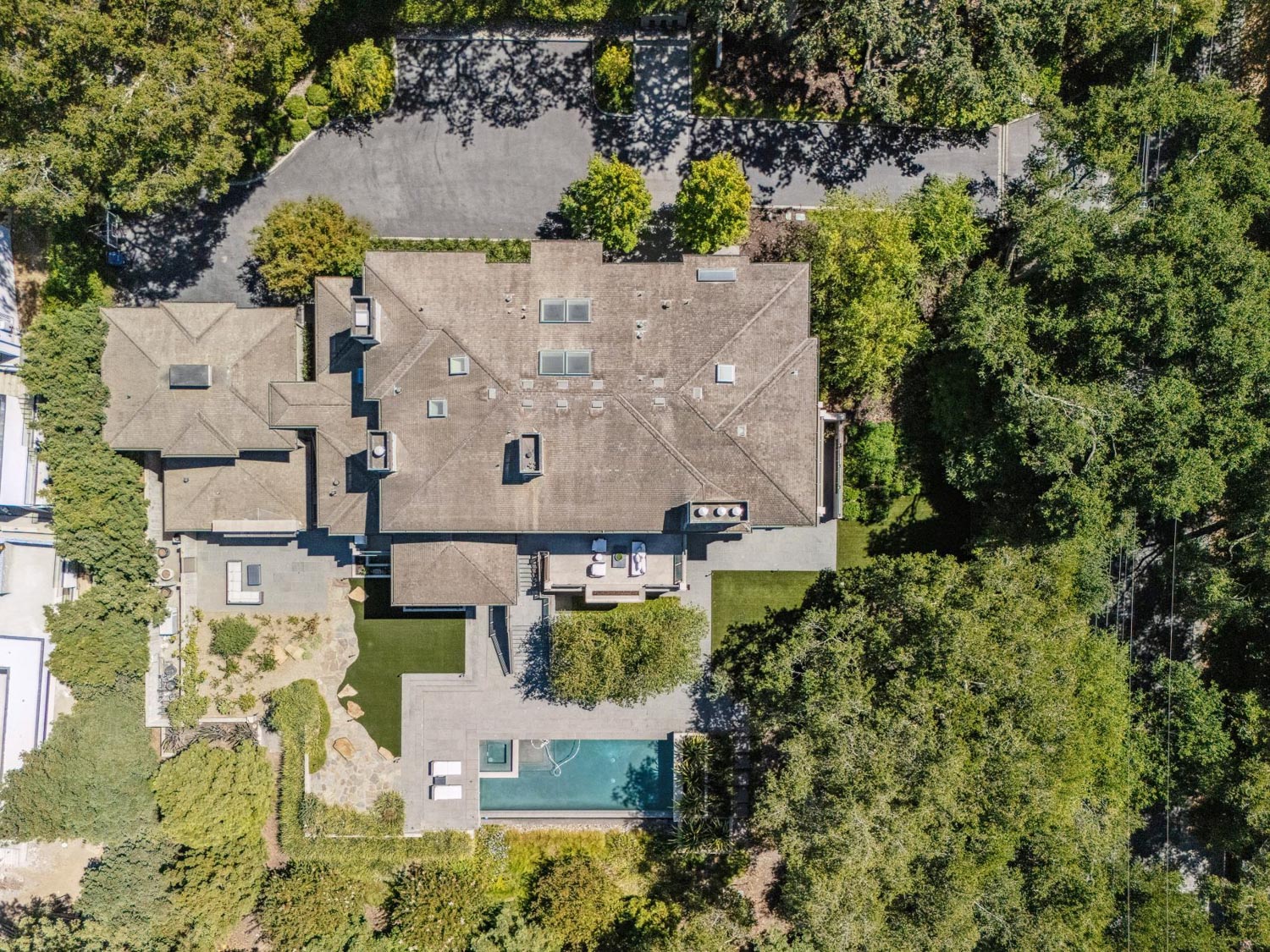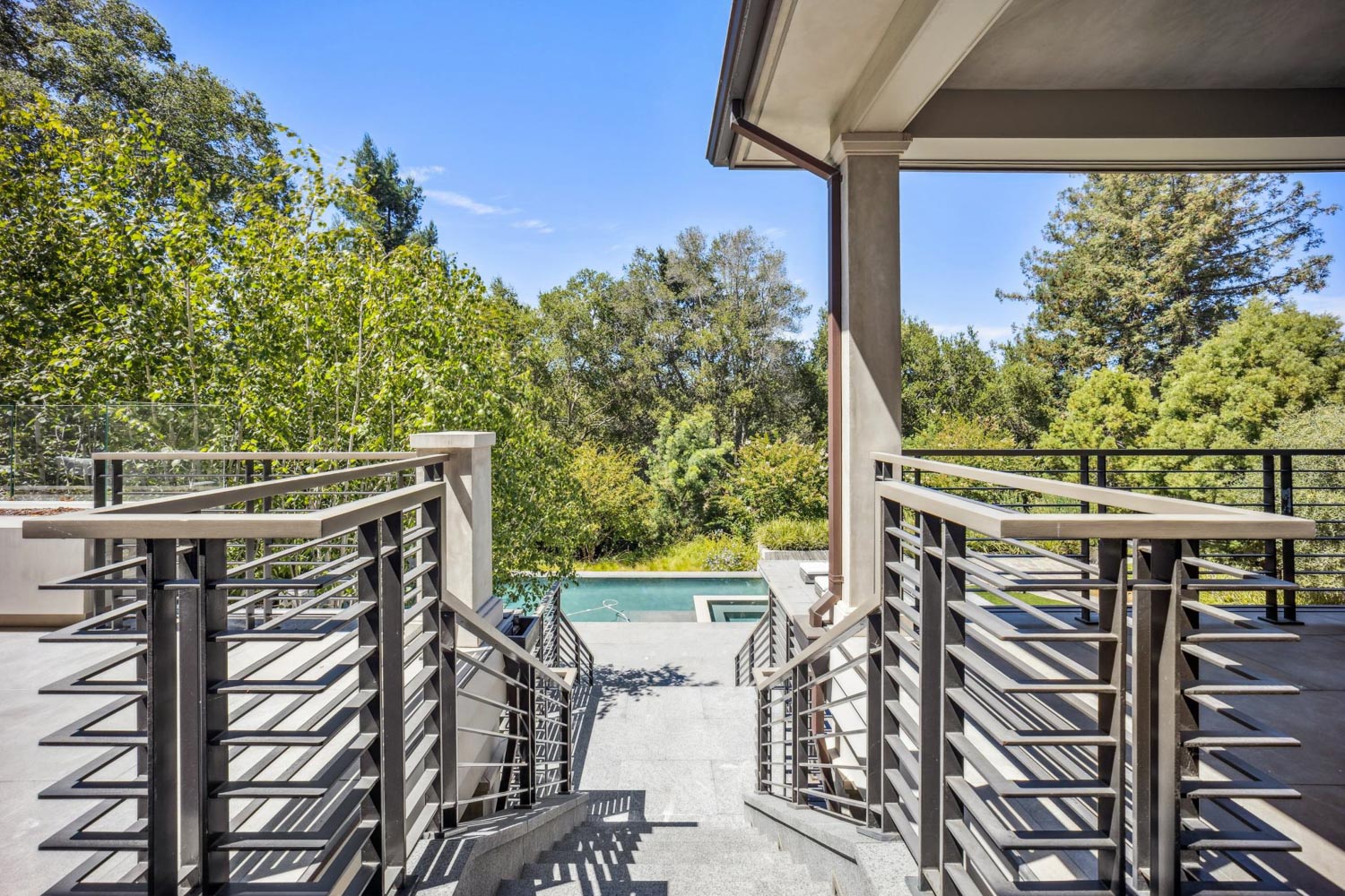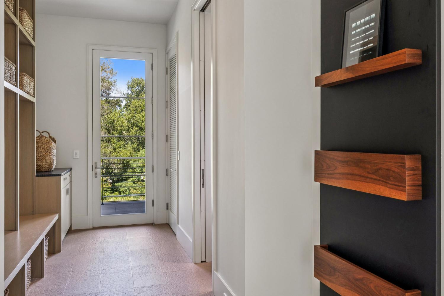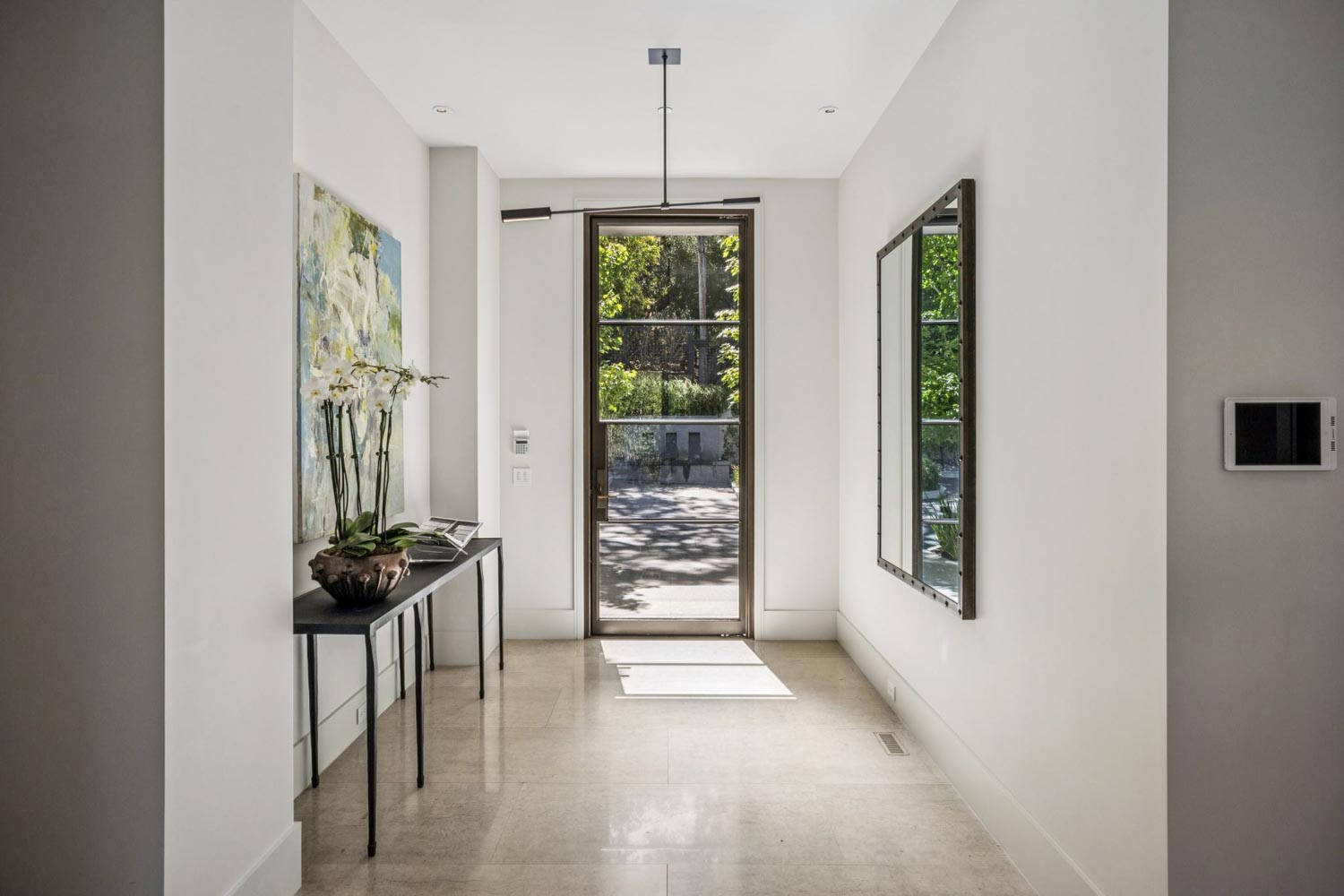 Acclaimed landscape architect Pamela Burton designed the incredible grounds to create privacy and offer different options for relaxing, playing, and entertaining. The ‘upper patios’ off the home serve as gathering places to relax and dine off all the major public rooms. A dining area with an adjacent built-in barbecue is located off the family room and kitchen area. A large staircase leads to the lower level of the yard, which includes a field for playing, a pool and spa with fountain, different lounging areas, a loggia, and an exercise porch. A guest house/cabana adds another amenity to the exterior, featuring a bar area with a sink and refrigerator and freezer drawers.