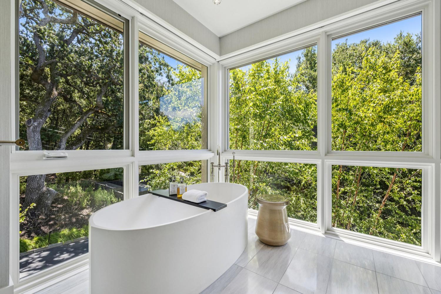 - The primary suite has a gas fireplace and two walls of windows. This space also has an inviting outdoor patio. A coffee bar leads to the closet and bathroom area. The coffee bar has two Sub-Zero refrigerator drawers. The closet has extensive shelving as well as drapery for a sleek look. The marble bathroom features a freestanding bathtub, a walk-in shower with two different showerheads, and double vanities. Additional built-in storage makes this primary suite an ideal retreat.