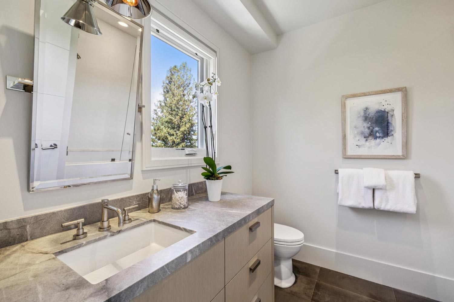 - Formal powder room with marble vanity and sconces built into the vanity.